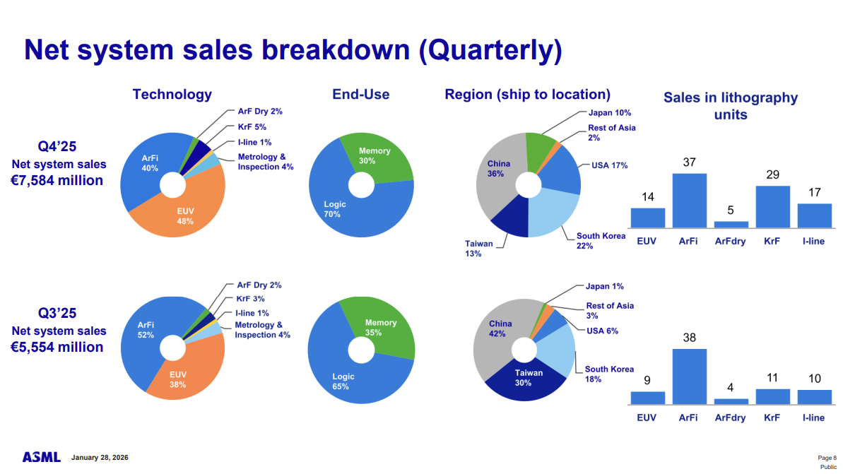 Toch zijn er ook onzekerheden. China was in Q4 goed voor 36% van de systeemverkopen, maar ASML verwacht dat dit aandeel terugvalt richting 20% door exportrestricties. Hoewel Chinese klanten vooral oudere DUV-technologie kopen, blijft de geopolitieke context een factor die beleggers nauwlettend moeten blijven volgen.