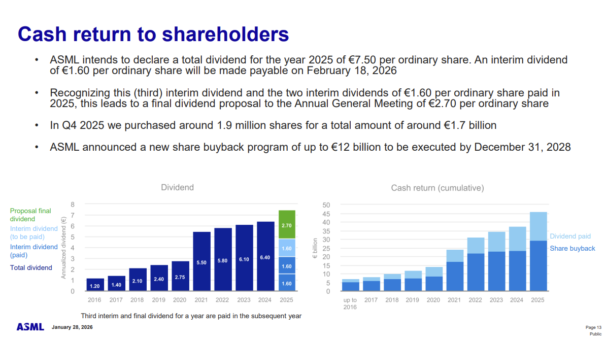 ASML blijft bovendien een uitzonderlijke cash machine. Het bedrijf kondigde aan een nieuw aandelen-inkoopprogramma van €12 miljard te starten tot eind 2028. Daarnaast stijgt het dividend verder door naar €7,50 per aandeel, wat neerkomt op 0,58% dividendrendement bij de huidige koers van €1280.