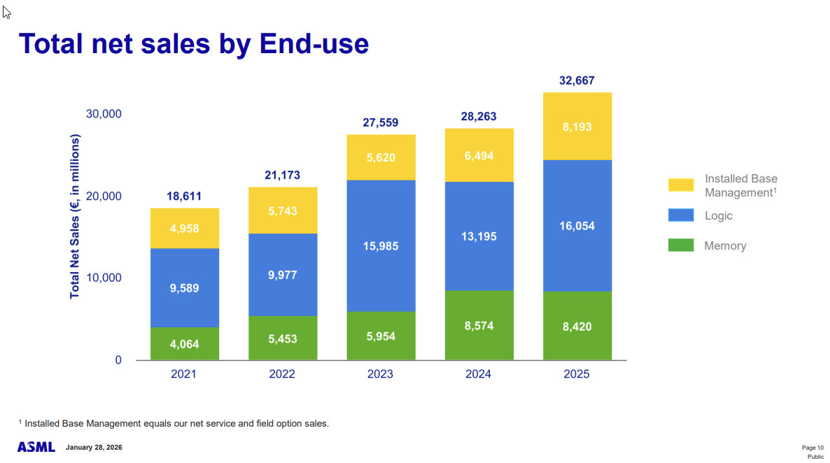 Wat vooral opvalt is dat ASML steeds minder afhankelijk wordt van eenmalige machineverkopen. De Installed Base – service, onderhoud en upgrades van bestaande systemen – groeide opnieuw sterk en begint steeds meer te lijken op een terugkerend inkomstenplatform.