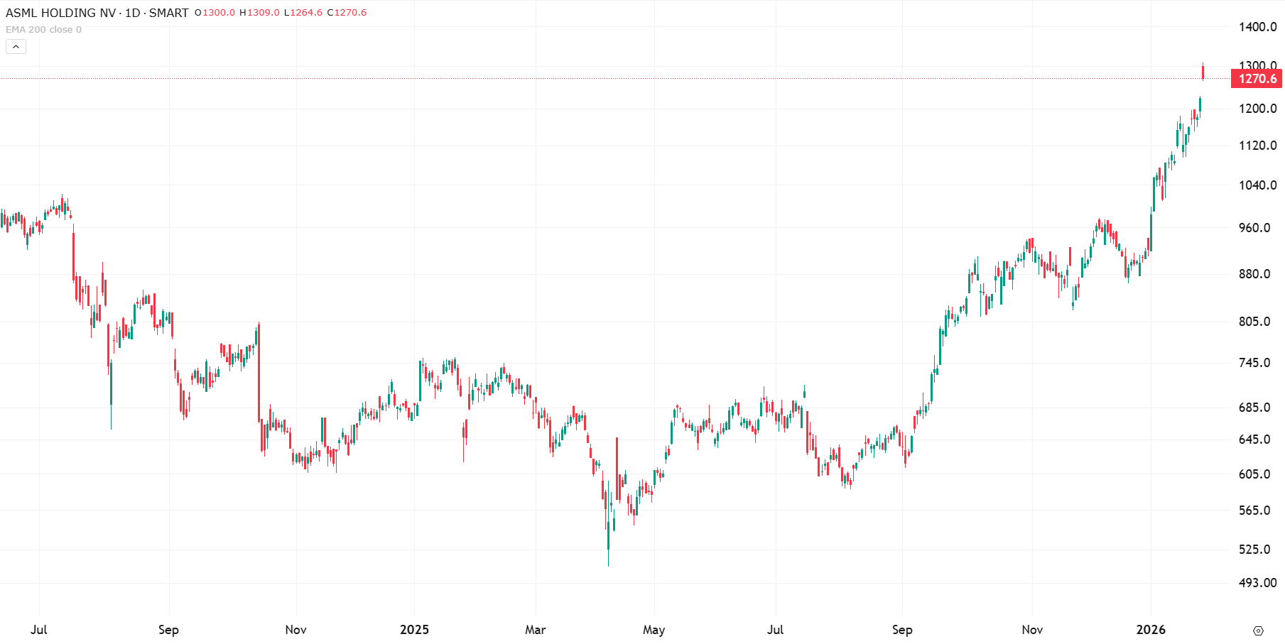 De koers bereikte vanochtend een nieuwe all-time high op 1309 euro om vervolgens intraday wat terug te zakken. Dit jaar staat de chipmachinemaker al op een winst van 29% en sinds het dieptepunt an april 2025 is de koers zelfs met ruim 125% gestegen.