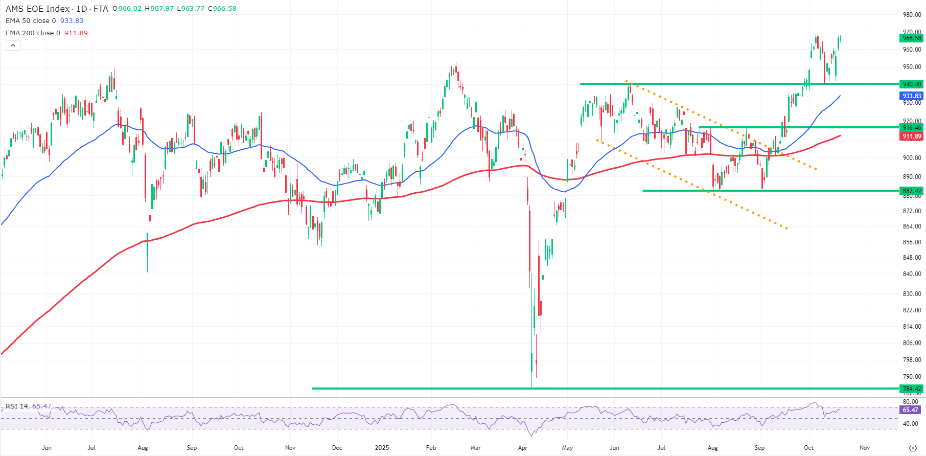 De rente op Amerikaanse staatsobligaties daalde opnieuw, met de 10-jaars Treasury yield die onder de 4%-grens zakte tot 3,96%. Dat kan steun bieden aan groeiaandelen, maar de vrees voor de impact van de aanhoudende overheidsstilstand zet mogelijk een rem op het sentiment. Volgens economisch adviseur Kevin Hassett zou de shutdown mogelijk nog deze week kunnen eindigen.