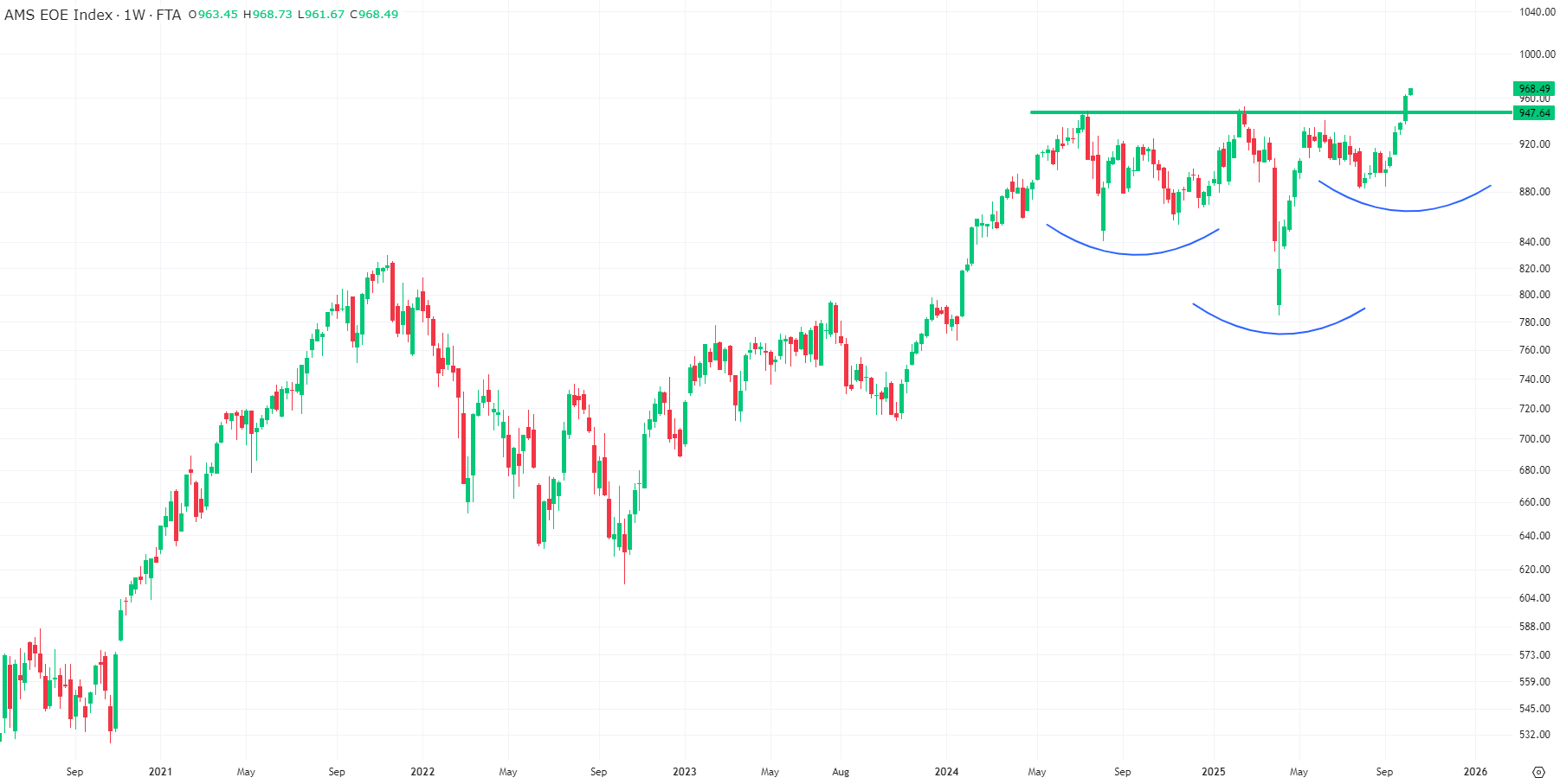 De AEX heeft de afgelopen week opnieuw een sterke prestatie neergezet. Met een slotstand boven de voormalige all-time high op 952,45 is de index overtuigend boven de vorige toppen uitgeklommen. Zowel de daggrafiek als de weekgrafiek tonen nu een krachtig technisch beeld dat de weg vrijmaakt voor verdere stijging.