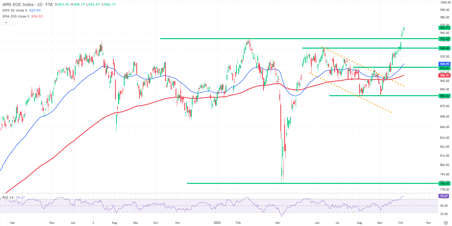 Op de daggrafiek zien we dat de AEX sinds de doorbraak boven 916,46 punten in een duidelijke opwaartse trend zit. De koers beweegt inmiddels ver boven zowel de EMA50 (906,95) als de EMA200 (920,94), die beide stijgend zijn, zijn een klassiek teken van kracht. Ook het voormalige weerstandsniveau rond 952,45 punten is overtuigend doorbroken. Dit niveau fungeert nu als eerste steun bij een eventuele correctie.