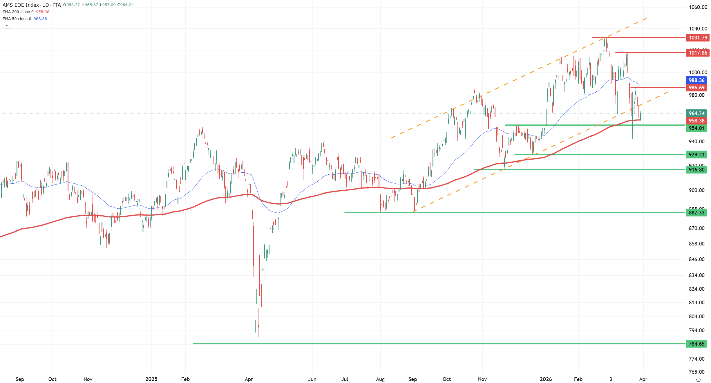 De AEX bevindt zich op een technisch interessant kantelpunt. Op de korte termijn is sprake van verzwakking, met een dalende trend en een uitbraak uit het stijgende trendkanaal. Tegelijkertijd wordt een belangrijke steunzone rond 950 punten getest.