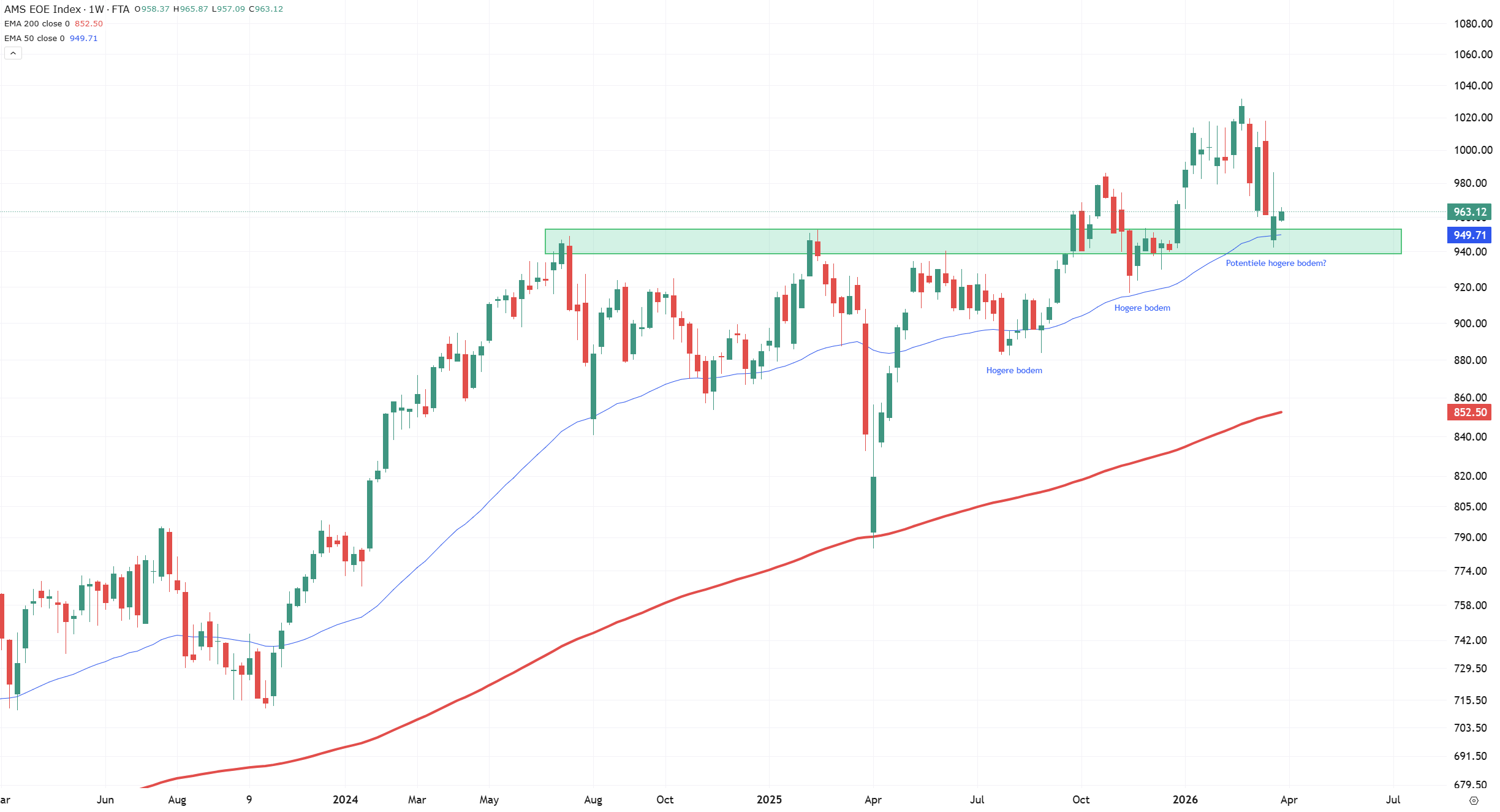 Op de weekgrafiek blijft het grotere plaatje vooralsnog constructief. De zone rond 950 punten speelt hierbij een sleutelrol. In zowel 2024 als 2025 werden rond dit niveau meerdere toppen gevormd, waardoor het een belangrijke weerstand vormde.