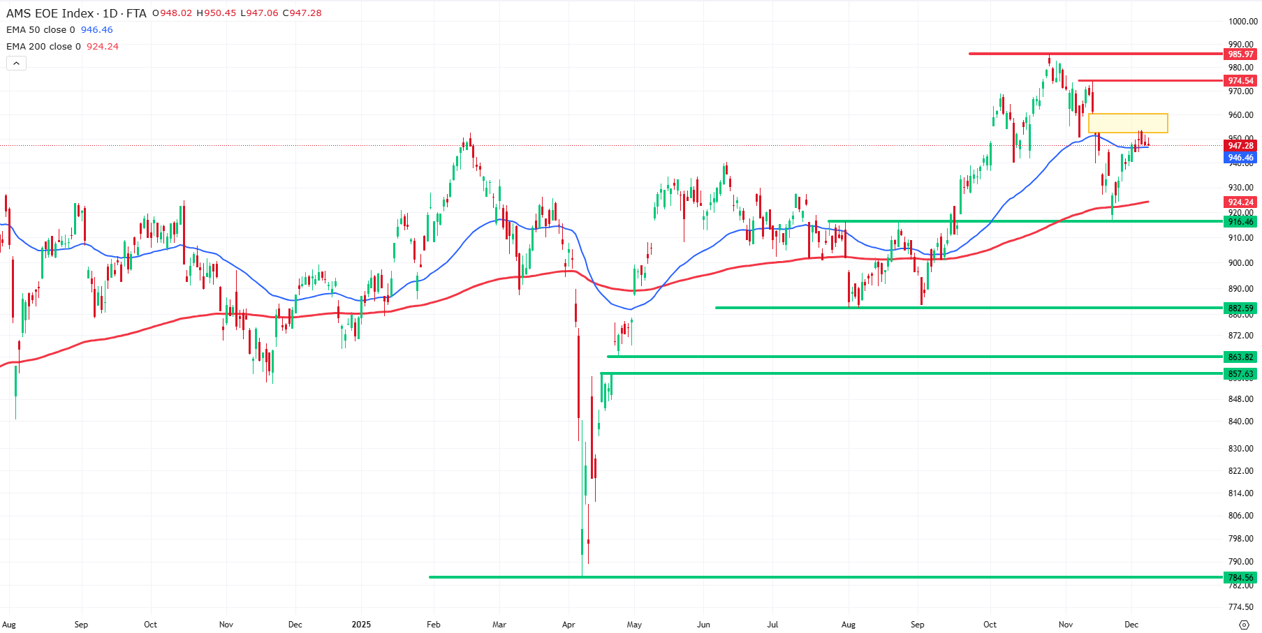 Naast de sterke positie boven de EMA50 is ook de EMA200 van belang. Deze langere gemiddelde lijn ligt rond 924 punten en biedt stevige steun. Dat de AEX ruim boven de EMA200 beweegt, bevestigt dat de langetermijntrend onverminderd stijgend is.