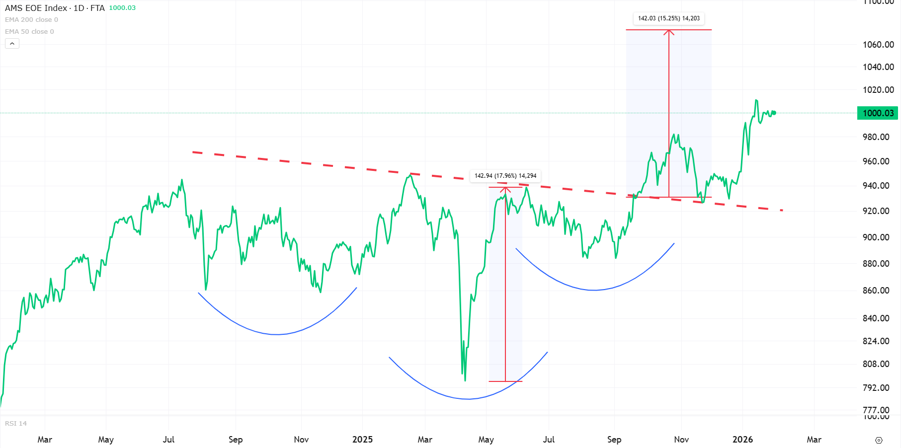 De stijgende EMA200, momenteel rond 943 punten, bevestigt dat ook de langetermijntrend opwaarts blijft. Volgens de klassieke trenddefinitie van Murphy geldt: zolang de index boven dit gemiddelde noteert, is er geen sprake van een structurele trendbreuk.