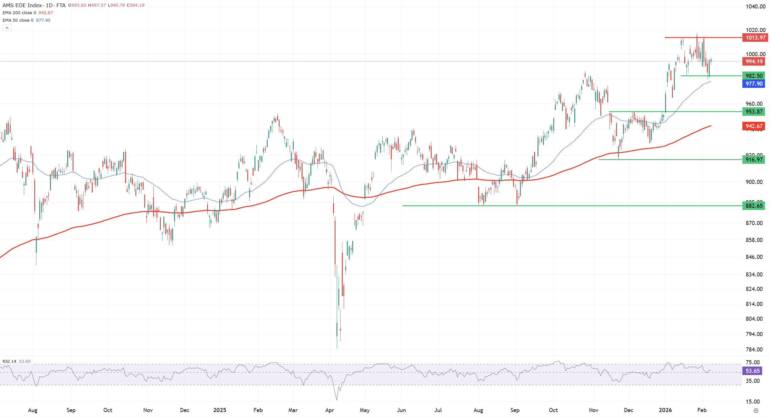 Een neerwaartse doorbraak onder 982,50 zou het beeld tijdelijk verzwakken. In dat scenario ligt een terugval richting de steun rond 953,87 punten voor de hand, waarbij ook de EMA200 opnieuw in beeld komt als belangrijk vangnet.
